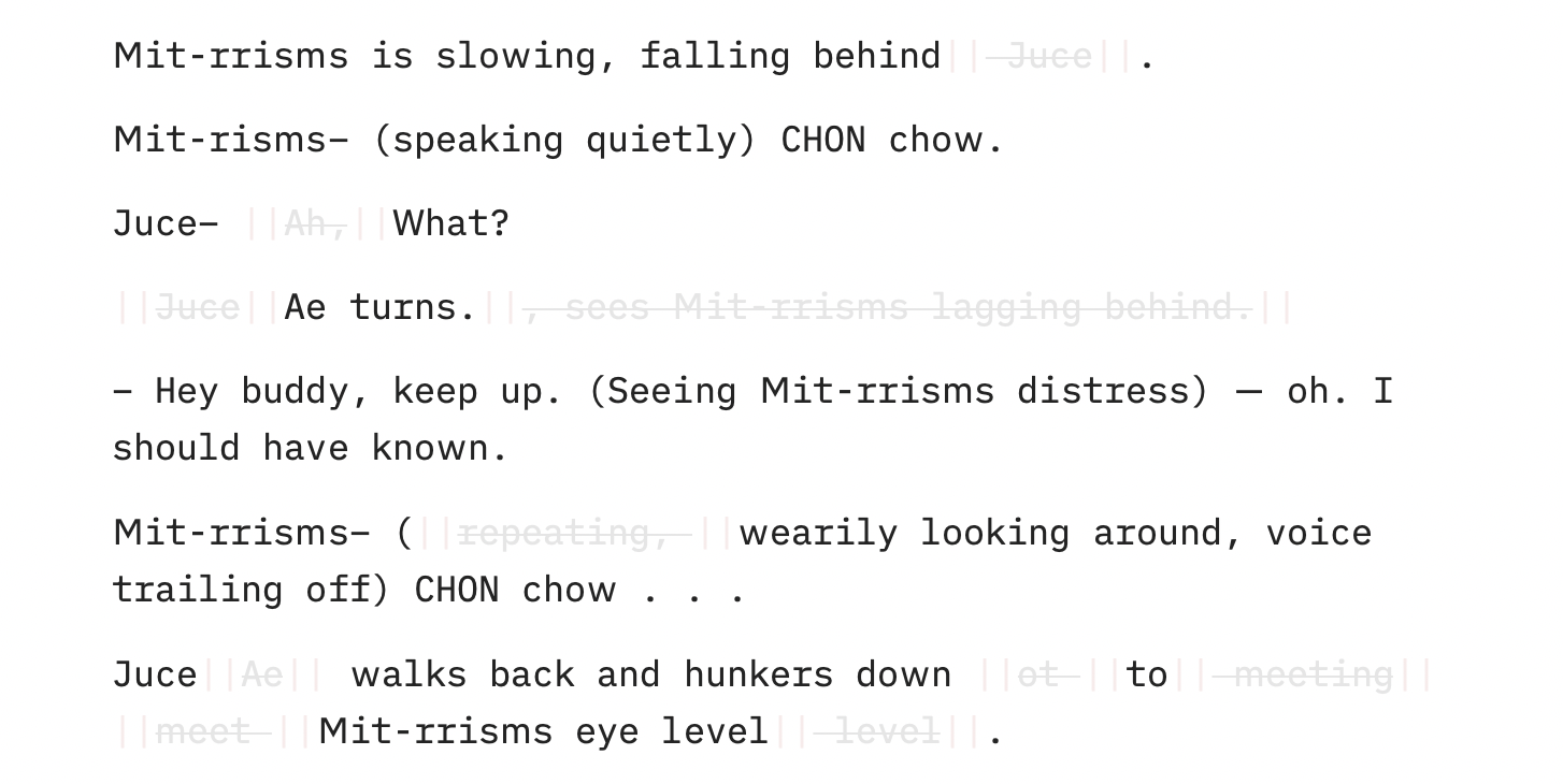 I found a solution. I write with Ulysses, a Mac/iOS application. Ulysses has an easy-to-use tool for creating customized themes1: collections of colors and font styles showing the status of text. Is it a heading? (black and bold) A comment? (green, why not?) Is it marked for deletion? (strikethrough text, duh) And so on. Ulysses also has a library of user created themes to peruse. I found a theme called Prose Writer. It wasn’t colorful: all black, white, and gray, but eureka! Text marked for deletion is a slightly darker off-white than the page background. I could mark text for deletion without actually deleting it, and it would almost disappear into the background.